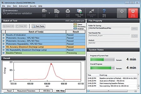 UV validation software (limited function edition) is included as standard. Using this software, inspections can be implemented as stipulated for 9 items in JIS and the JP. If optional UV validation software (USP/EP compatible edition) is added, examinations can be implemented as stipulated in the USP and the EP.